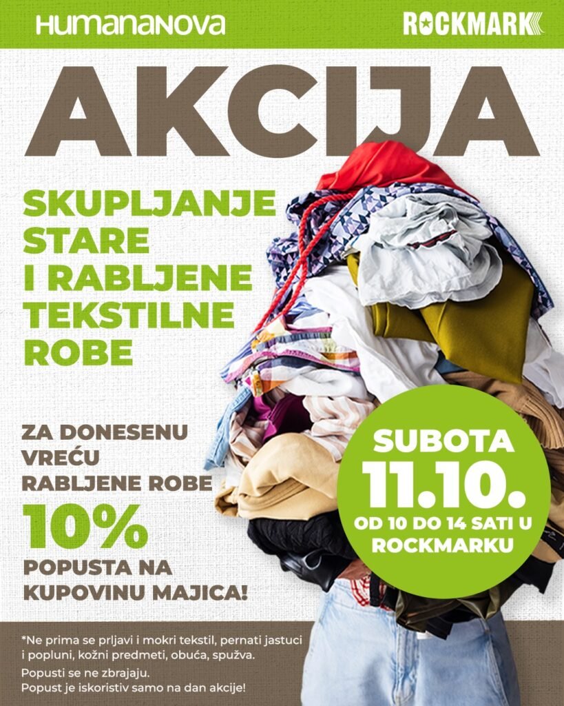 U subotu, 11. listopada, od 10 do 14 sati u Rockmarku (Ulica Hrvatske bratske zajednice 4), možete donijeti viškove tekstila, a za vreću rabljene tekstilne robe možete ostvariti 10% popusta na kupovinu majica!